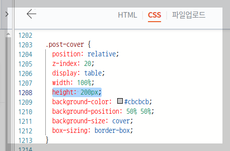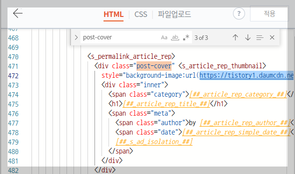 편집 창에서 'Ctrl + F' 눌러서 'post-cover' 를 검색하면 아래와 비슷한 부분을 찾을 수 있다.